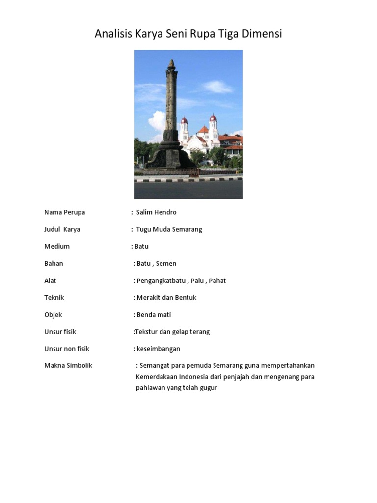 Contoh dari karya seni rupa 3 dimensi yang memiliki fungsi sebagai peringatan antara lain yaitu kesaktian pancasila sebagai pengingat kejadian g30 s pki yang sangat berpengaruh terhadap adanya sejarah bagi bangsa indonesia, dan karya seni dan karya seni sejenis yang lainnya. Patung dan relief adalah karya seni rupa tiga dimensi, yang dibuat dari bahan dasar batu dan kayu menggunakan teknik …. Bisa kita lihat banyak sekali masjid peninggalan jaman dahulu ataupun tempat. Analisis karya seni rupa 3 dimensi. Jika pada seni rupa 2d hanya mempunyai 2 sisi.